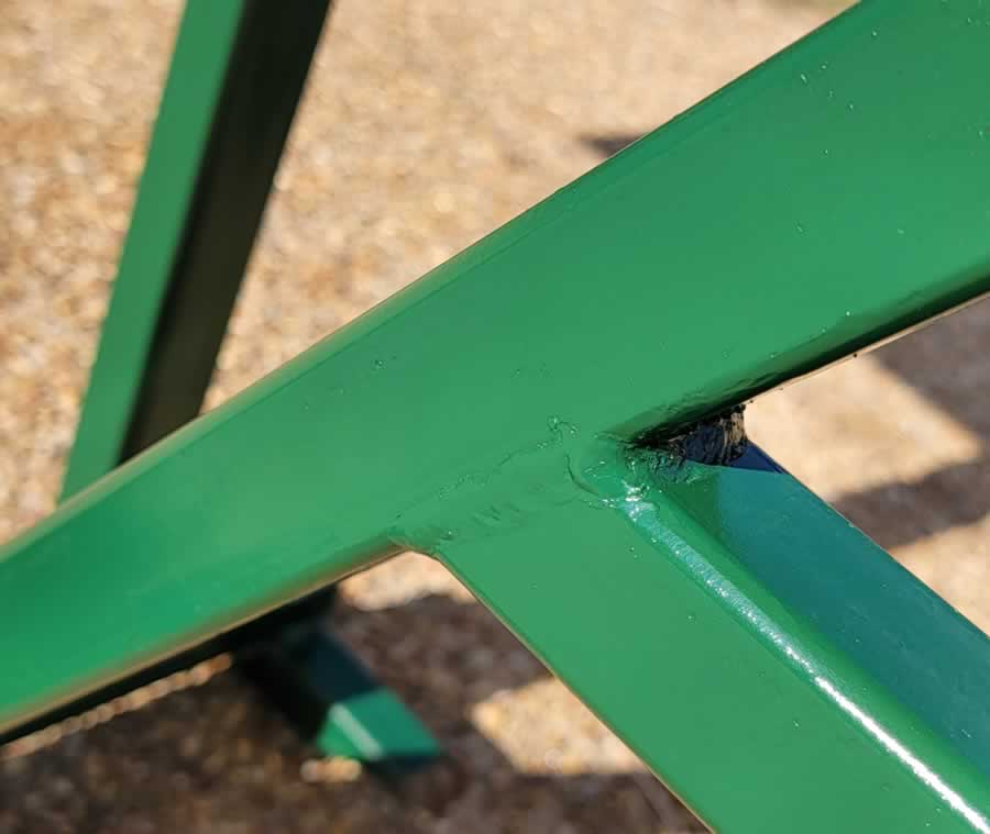 All welded construction. 1.5" x 1/8" square tubing. Where applicable, ends of tubing are deburred but are not capped/plugged. Plastic press-in plugs are available from hardware stores or online. Welds (as pictured) will show fillet, and will not be ground down 100% smooth. Welds will be sufficiently dressed to be free of buckshot and burrs.